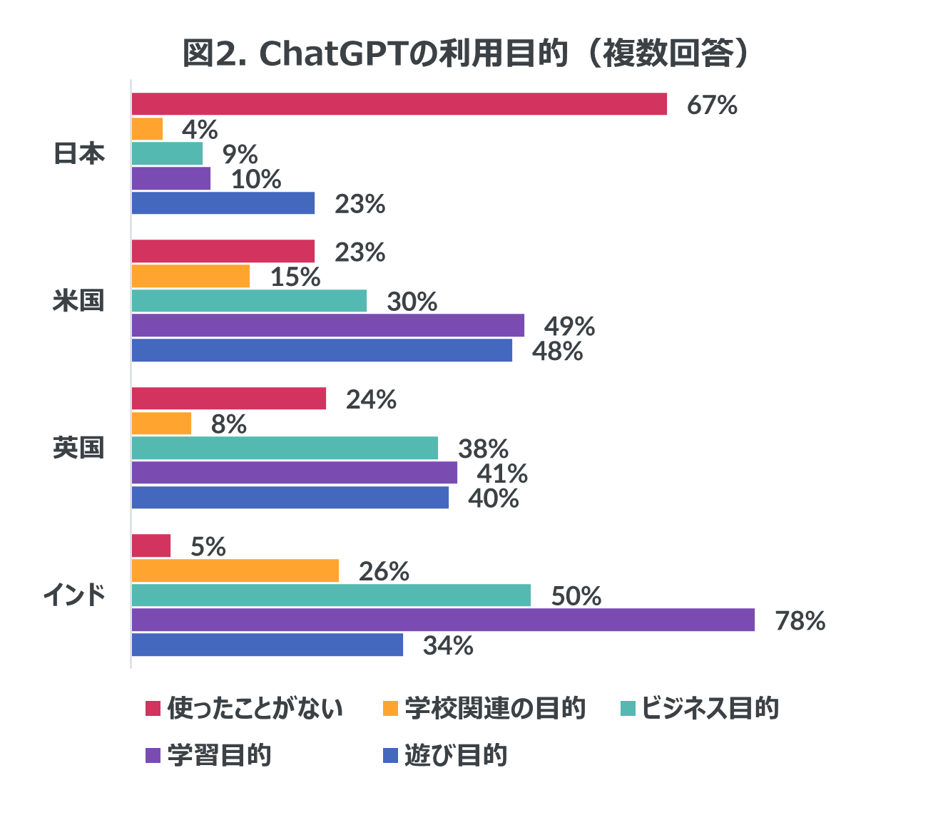 日本の回答者の内、回答率が最も高かった利用目的は「遊び目的」で23%、次いで「学習目的」で10%だった。この2つの目的は、他3か国の結果でも多く挙げられており、インド人の「学習目的」での利用は78%と群を抜いて高い。