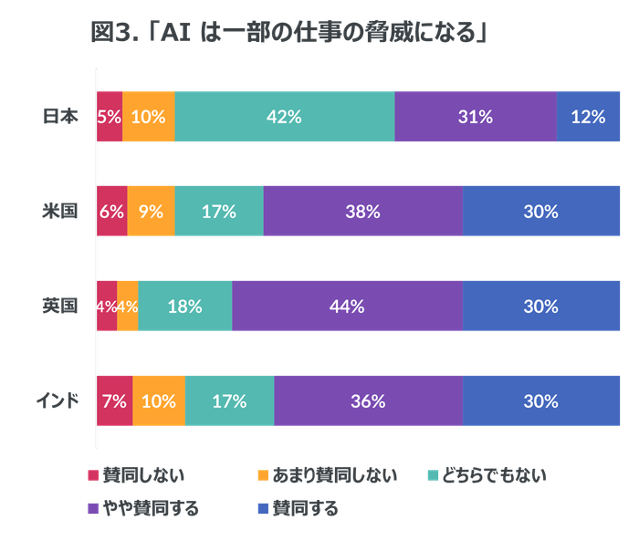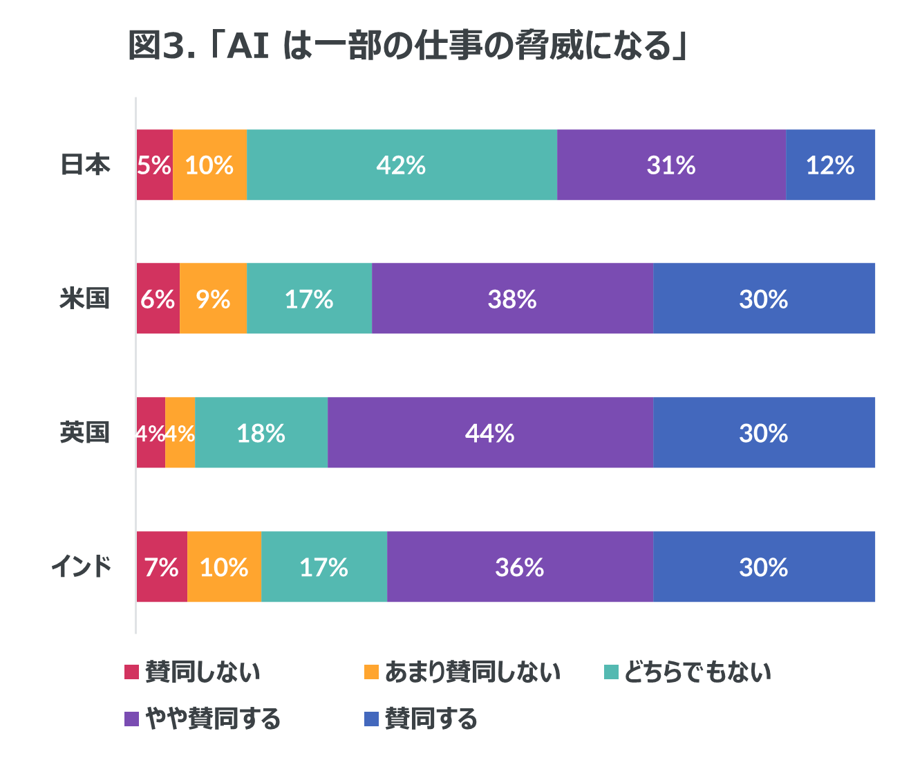 別の調査設問をみると、「AIは自分の仕事に影響を与えない」というステートメントに対して、日本人で賛同した回答者は11%だった。これはインド25%、米国19%、英国13%より低かった。