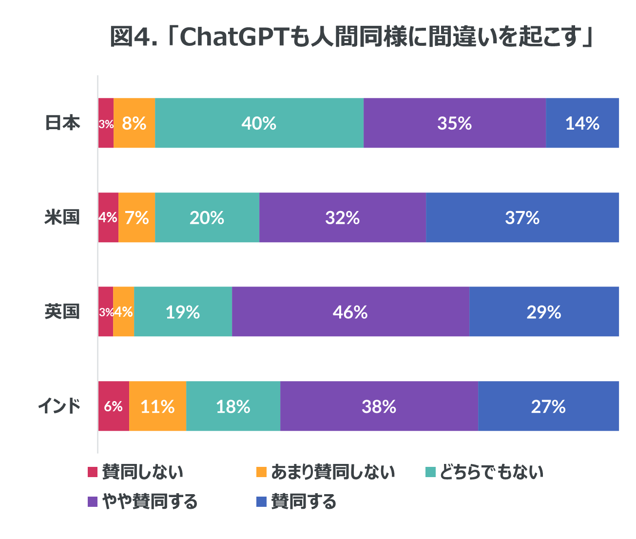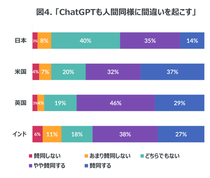米国、英国そしてインドでは30%近くがChatGPTが間違えることに賛同した。一方、日本では「賛同する」がわずか14%にとどまっている。仕事の脅威や影響と同じく、ChatGPTの回答精度に対しての認識も他国と差がある状態だ。