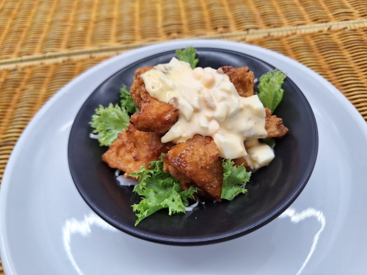 鮭を北海道名物のざんぎ風に仕上げました。サクサクに揚げた鮭の上に千歳産の卵で作ったタルタルソースをかけてお召し上がりいだきます。