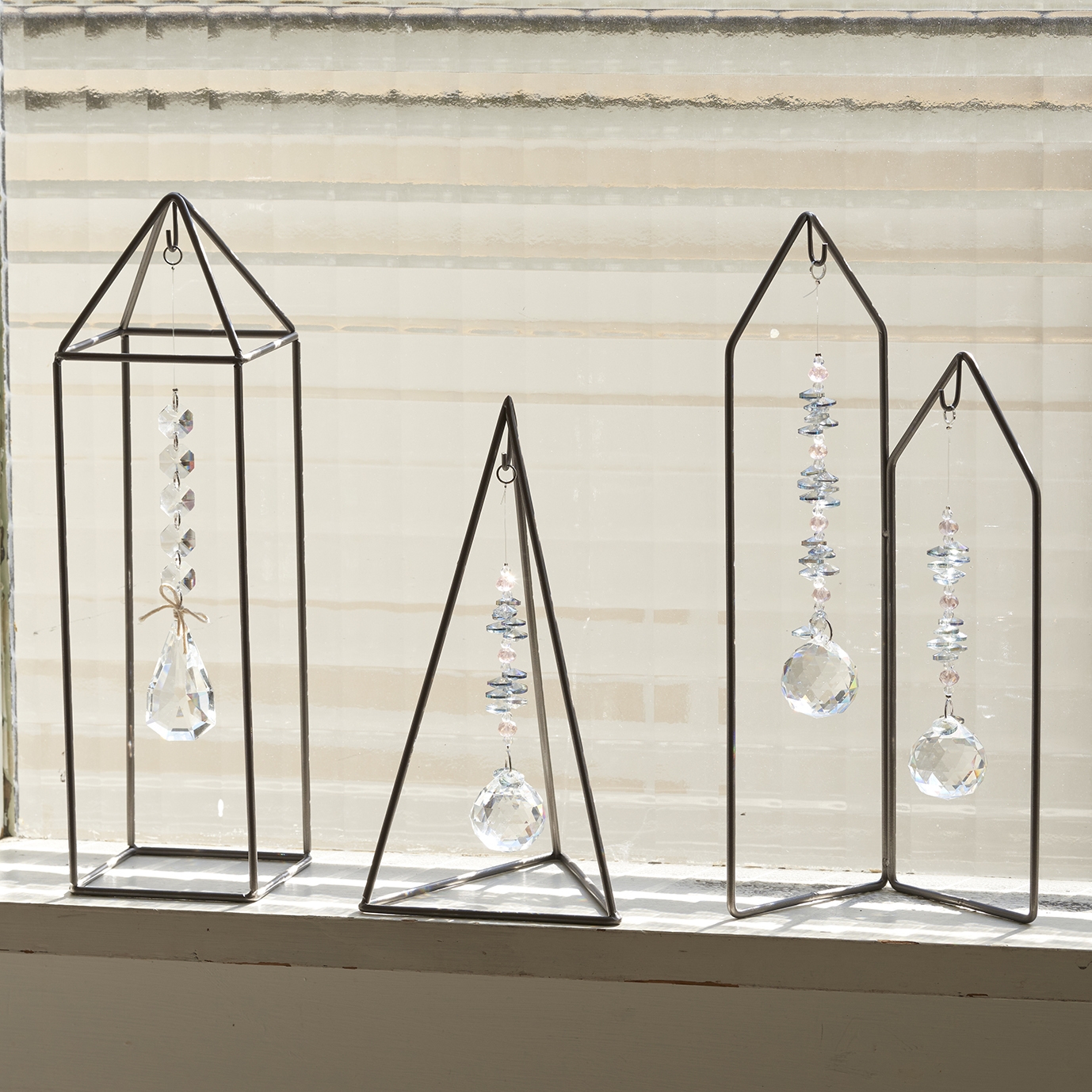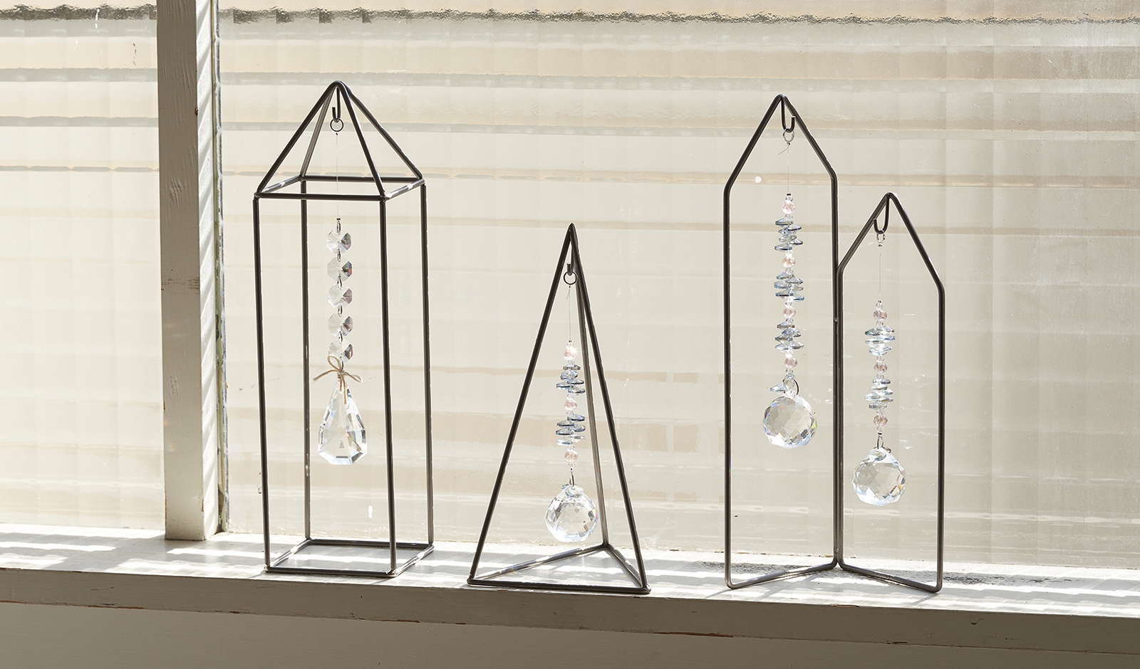 本体のガラスが太陽の光を浴びると、虹色のプリズムとなって空間に煌めきを与えてくれるサンキャッチャー。いずれも置き型タイプなので場所を選ばず飾ることができる上、ダークカラーの繊細かつシンプルなフレームと透明度の高いガラスで構成されたデザインは、どんなタイプのお部屋にも馴染みます。