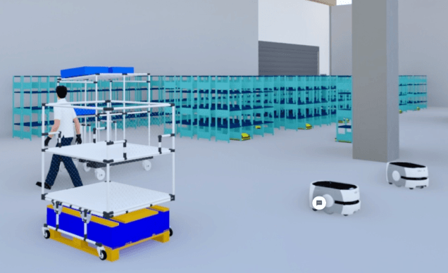 先行して、Techrumメンバーであるオムロン株式会社のAMRとシャープ株式会社の多階層ロボットストレージシステムをバーチャル展示しています。