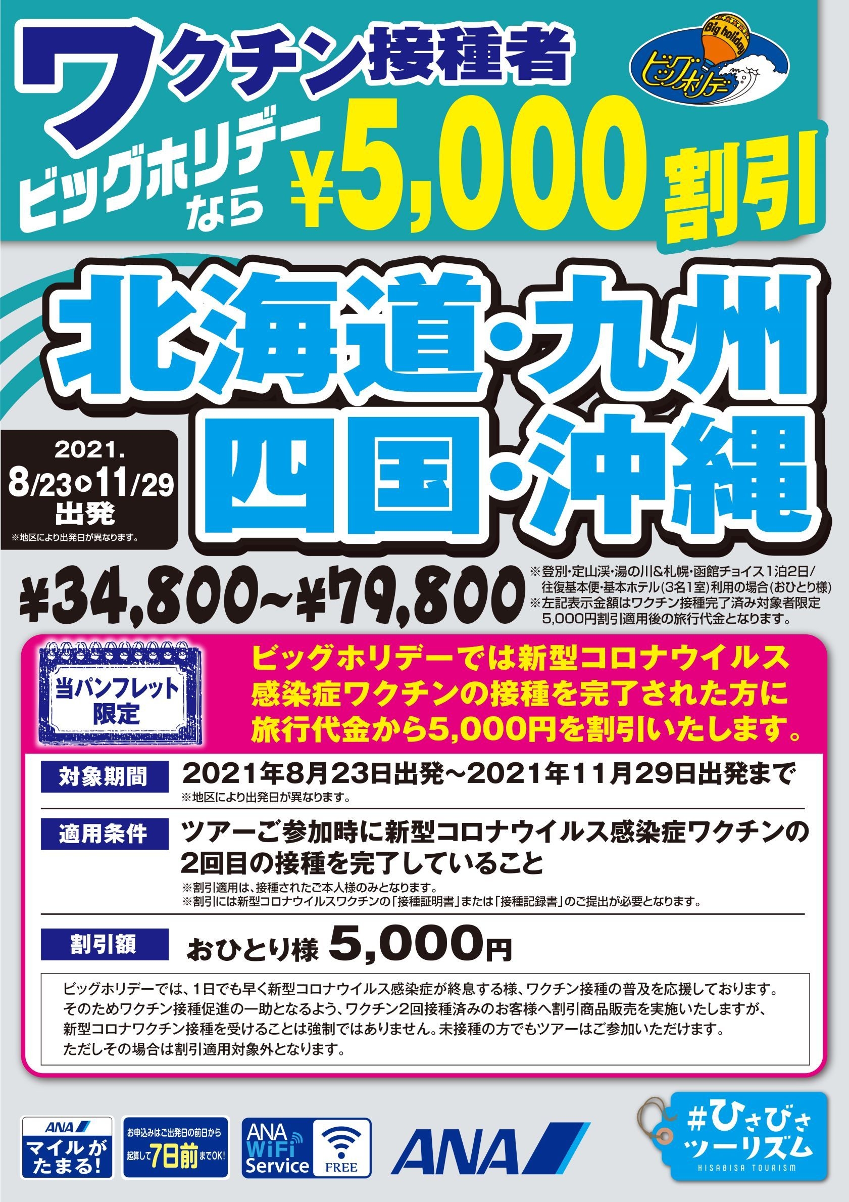 ビッグホリデー株式会社(本社:東京都文京区、代表取締役社長:岩崎 安利)は新型コロナウイルス感染症ワクチン接種促進の一助となるよう、ワクチン接種者を対象に1人あたり旅行代金より5,000円割引のサービスを受けることができる期間限定ツアーを2021年7月21日(水)より販売開始します。