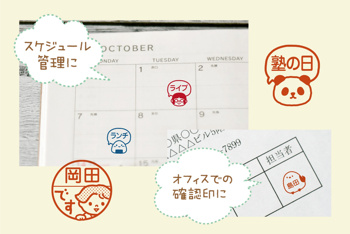 スケジュール帳や、回覧板のサイン、オフィスでのチェック印などにお使いいただけるキャップレス印鑑です。顔入りは、家族間のマークや家族カレンダーなどにもご活用いただけます。お子さまの宿題サインとして「みましたスタンプ」としてもオススメです。