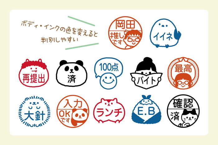 「再提出」「済」「Good」「みました」など、用途に合わせた文字を入れやすいデザインを目指しました。インクとボディカラーが選べるので、用途ごとに色分けすることができます。