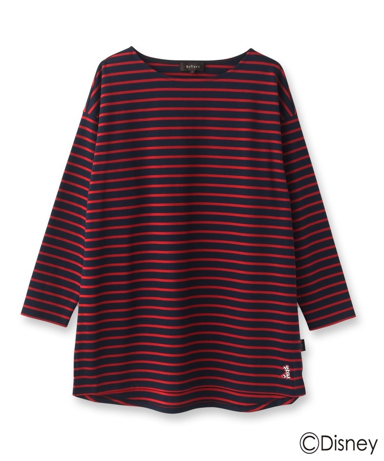 シンプルなデザインで着回し力のあるボーダーカットソー。オシャレなドット柄と「ミッキーマウス」の組み合わせが可愛く品のある刺繍アップリケがポイント。