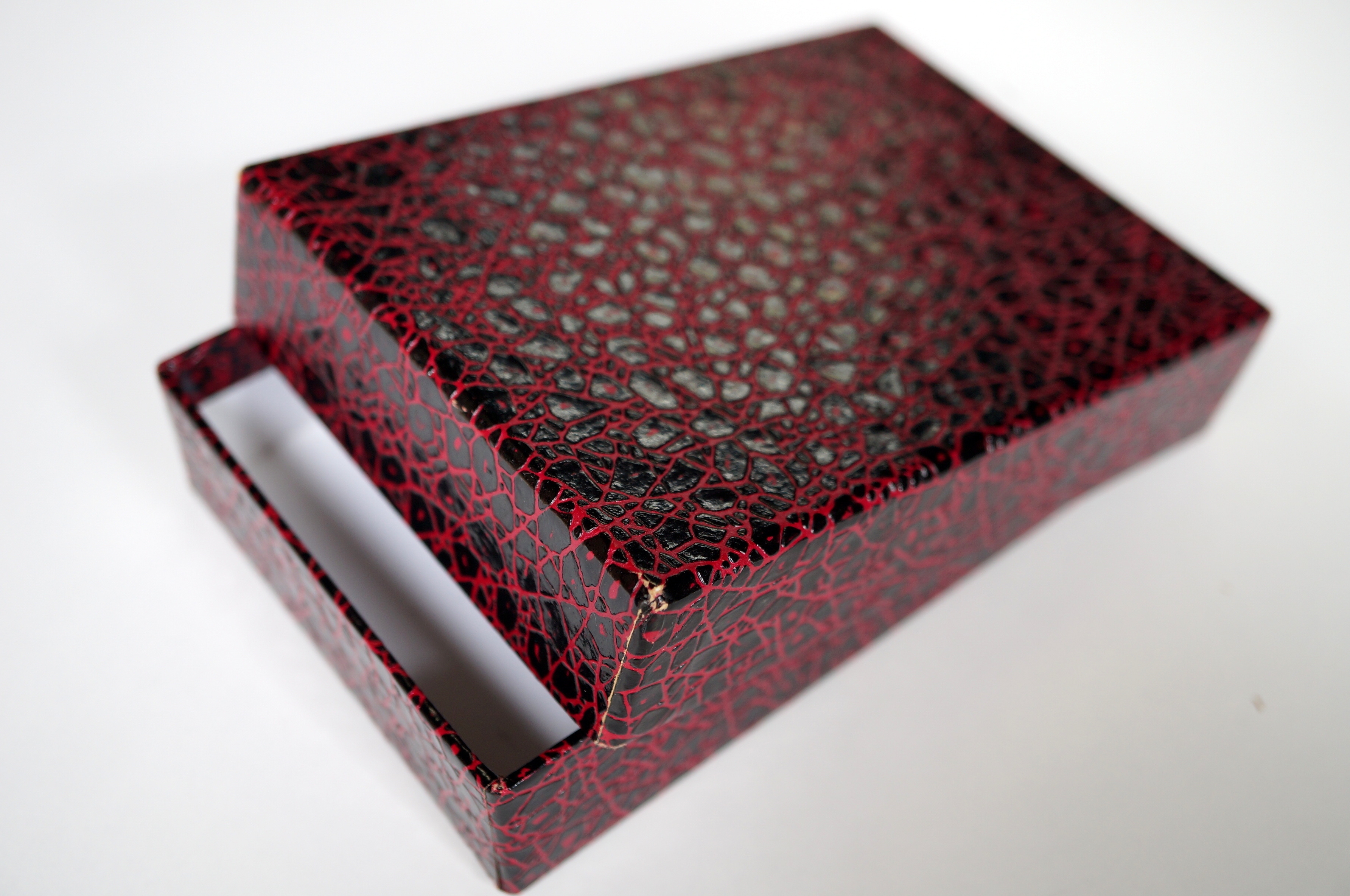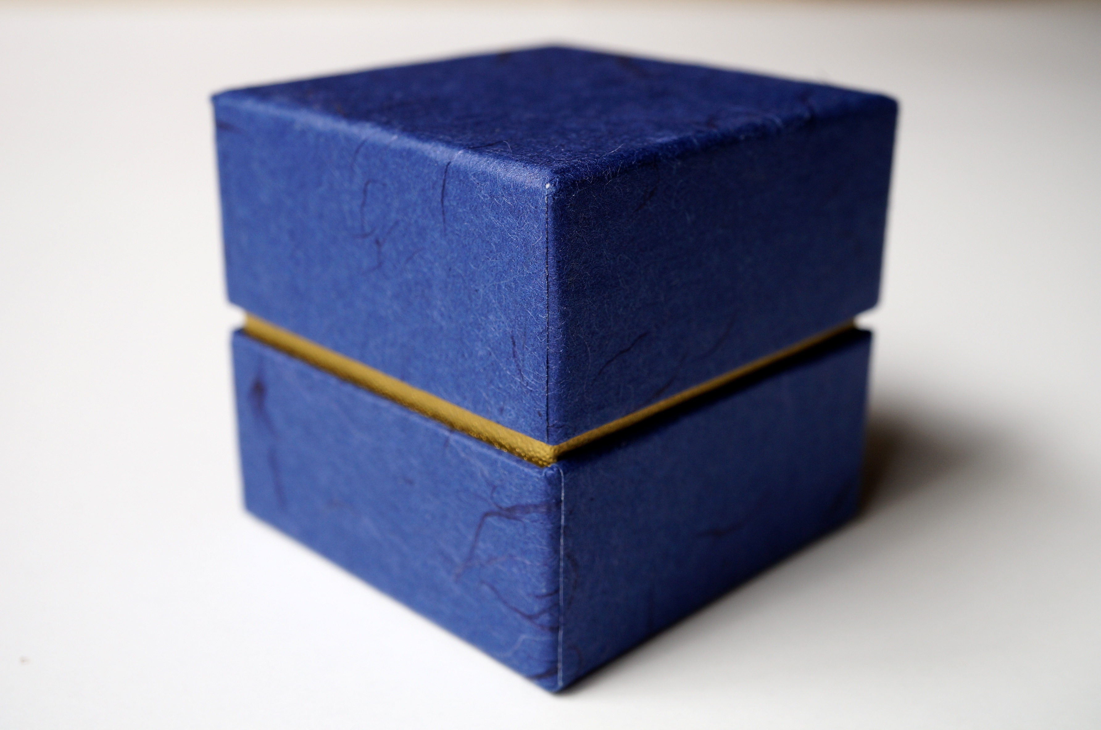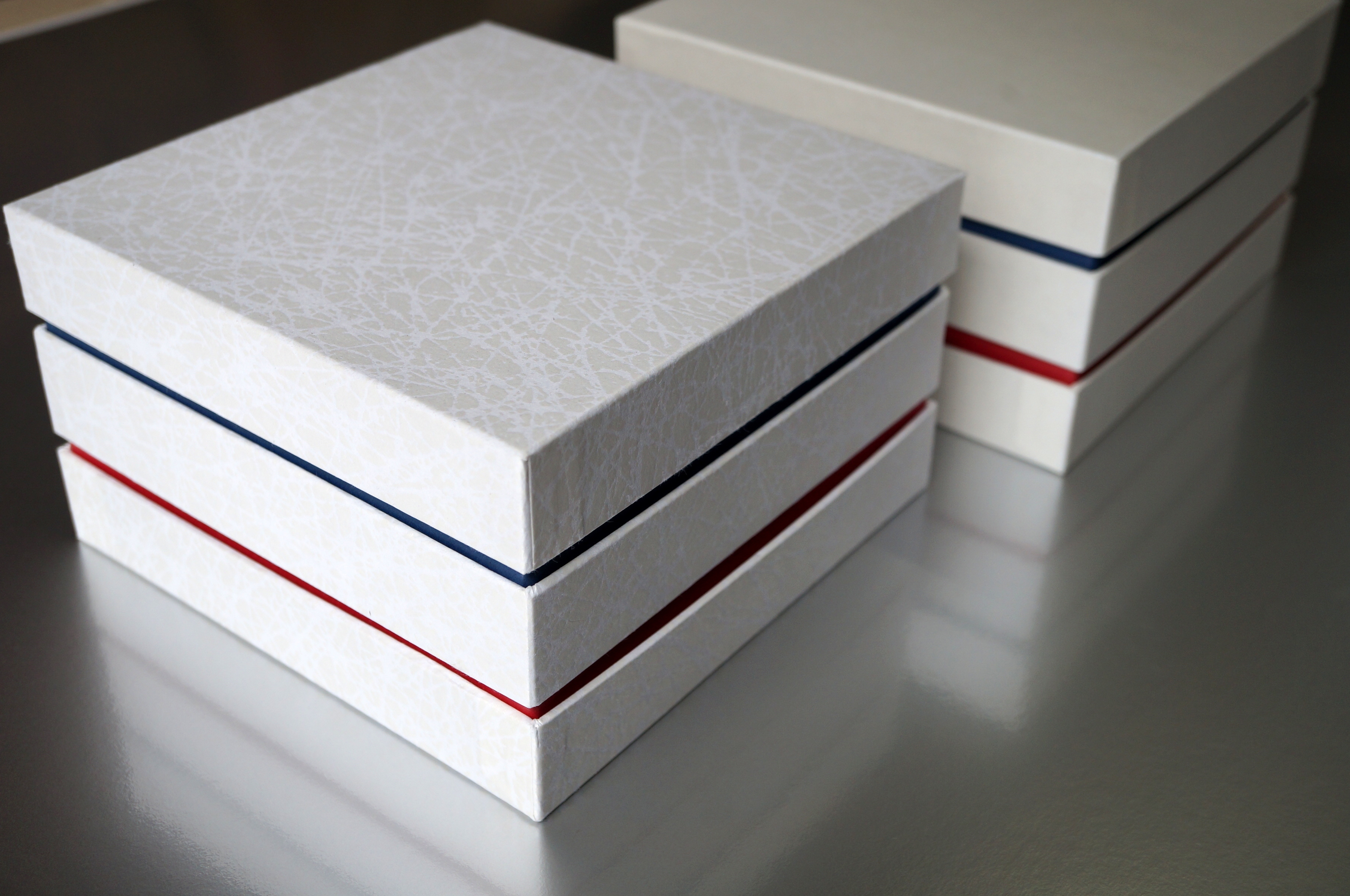ボール紙を生地にして箱を作り、四隅をクラフトテープで止め、その箱の大きさに合わせた和紙などの貼り紙を、専用の膠(にかわ)やゼラチンなどの接着剤で貼り込み、手加工で包んで仕上げる化粧箱。企業の商品や製品のブランド力向上を図るための紙製品。