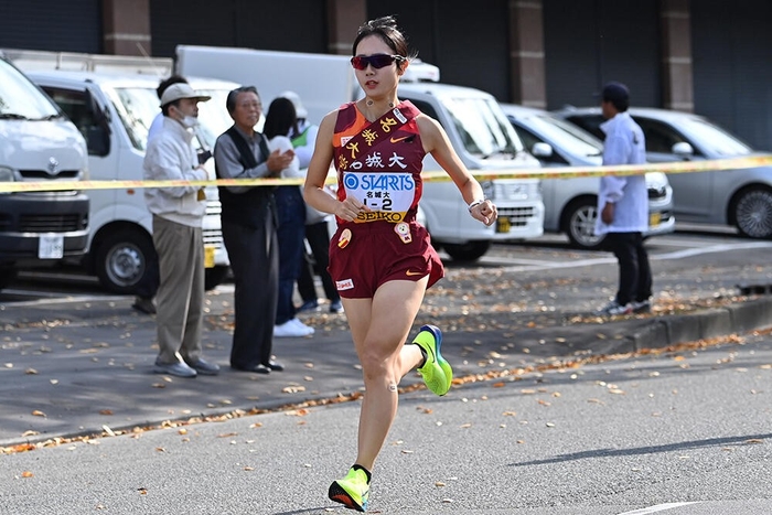 「自分の最大限の力を出す。1秒でも早くたすきを渡そうと思ってスタートラインに立った」と後に振り返るほど意気込んで走り出した。この区間ではトップが入れ替わり、立命館大学が首位を奪取。区間賞も立命館大学の山本釉未選手(1年)が獲得した。上野選手は拓殖大学にかわされたものの、前を走っていた兵庫大学を追い抜いて9位の順位を維持。中継点ではトップと1分24秒差で次の走者へたすきを託した。個人成績は13分23秒で区間10位。「初めての全国大会で全然戦えなかったのですが、すごくいい経験をさせてもらえたので、この経験を2ヵ月後の富士山女子駅伝や来年につなげていきたい」と、今後への糧を得る初駅伝となった。