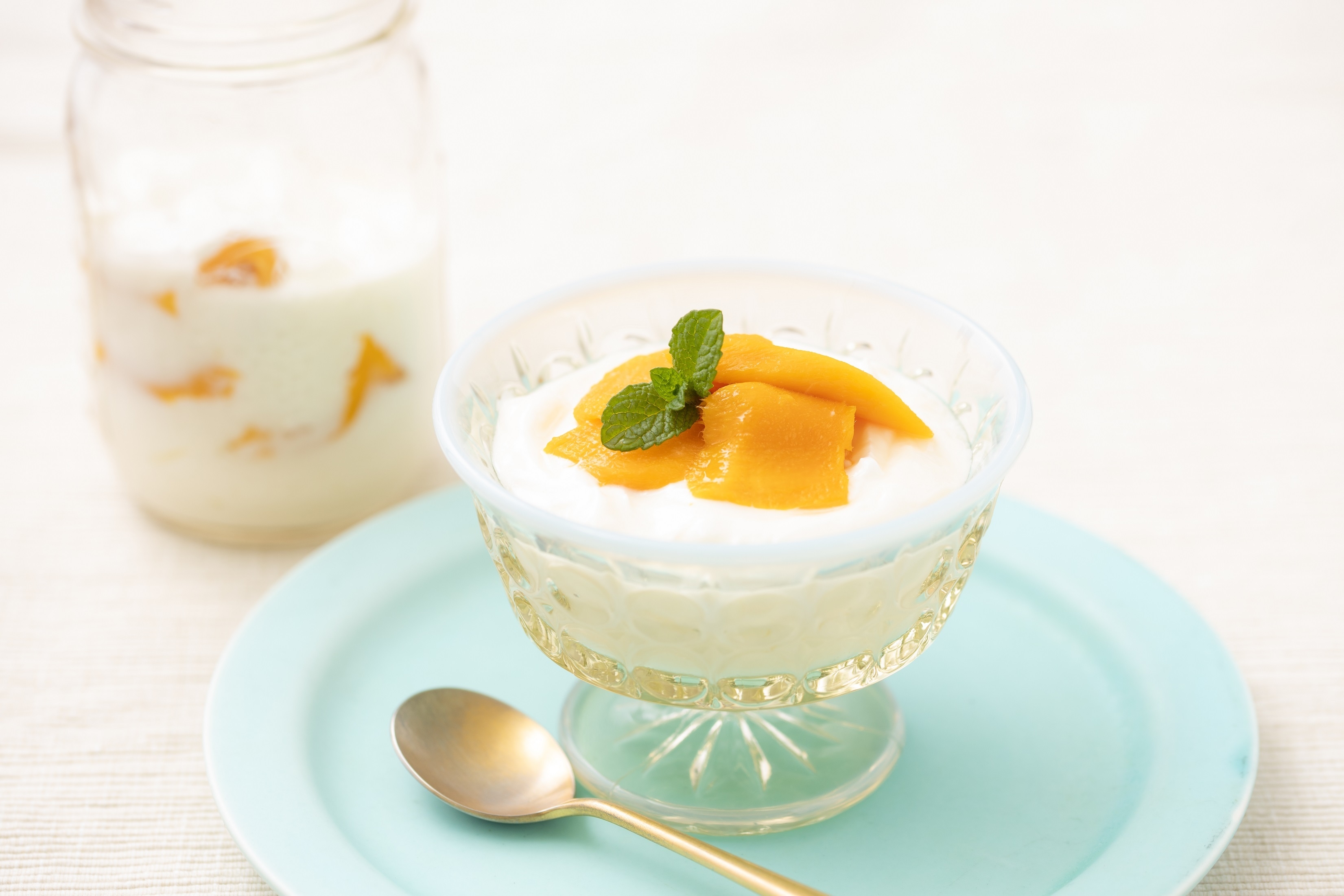 ヨーグルトの乳酸菌とマンゴーの食物繊維が腸内環境を整え、マンゴーのβ-カロテンが美肌作りをサポート。MCTオイルを入れることで、すばやくエネルギーになり、さらにマンゴーのβ-カロテンの吸収率がアップするという嬉しい効果が。ドライマンゴーをヨーグルトで戻すと驚きのプルプル食感に!ヨーグルトのうま味が凝縮されて、まるでクリームチーズのように味わいリッチなヨーグルトは、MCTオイルとの相性も抜群。さらに、凍らせると違った味わいが楽しめます。
