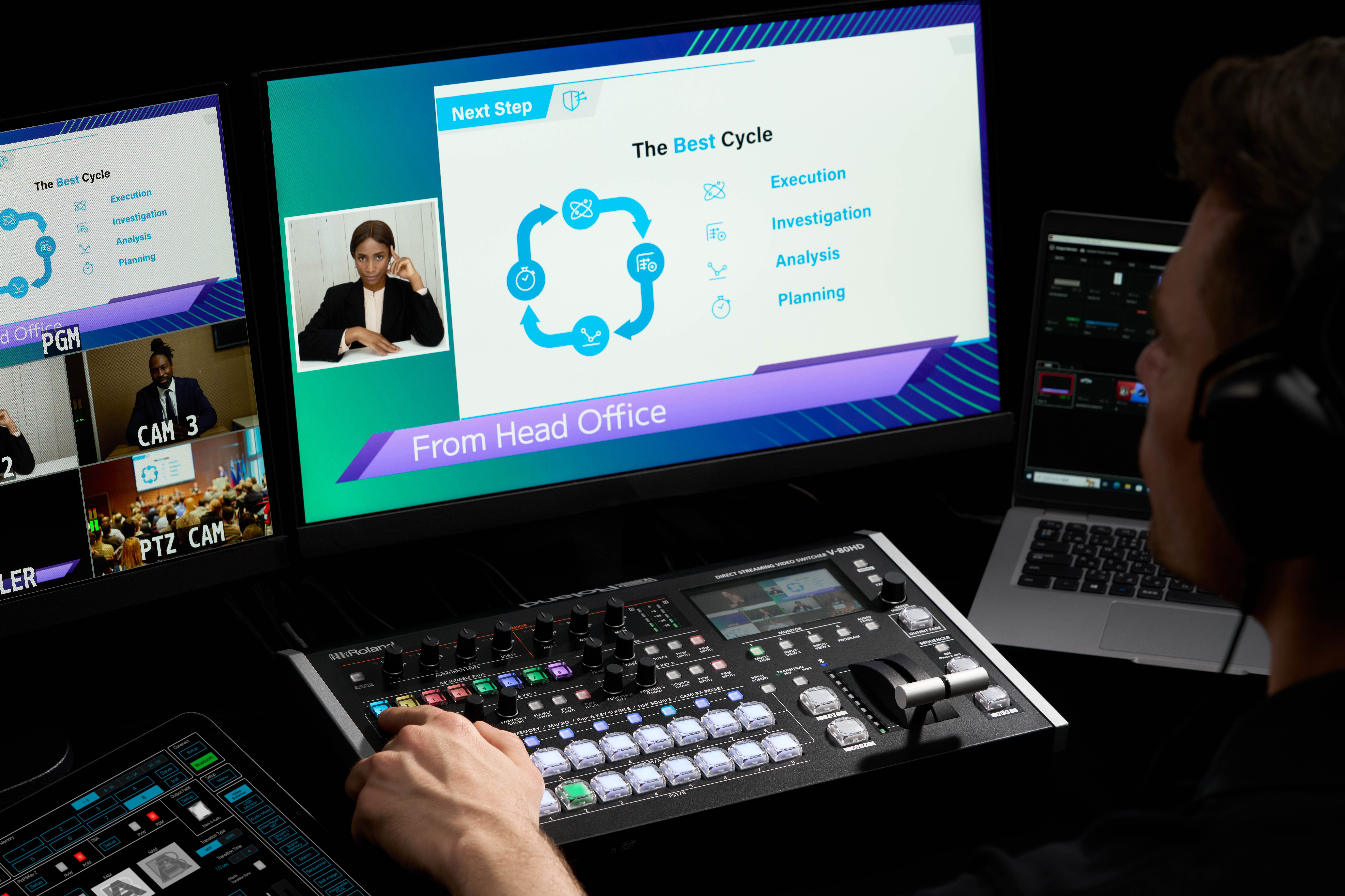 今回発売する『V-80HD』は、高く評価いただいているローランド「Vシリーズ」の操作性や安定性に加えて、現在求められる高い汎用性や、より高度な映像演出のニーズに応えるビデオ・スイッチャーです。業務用/民生用カメラ、PC、マイクなど幅広い機器を変換器なしでそのまま接続でき、設置作業はスムーズ。多彩な映像形式に対応します。筐体はコンパクト・サイズで場所を取らず、持ち運びも簡単です。さらに、ライブ配信用のUSB-C端子に加え、PCを使わず直接ライブ配信を行えるLAN端子も装備。画面レイアウトや操作手順の保存・呼び出しを簡単に行える機能、遠隔操作やモニタリングが可能なiPad/PC用の専用ソフトウェアなどの充実の機能を備えており、さまざまな用途で活躍します。
