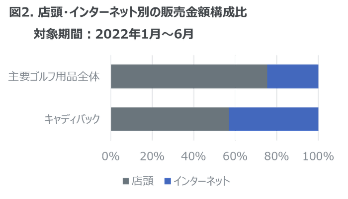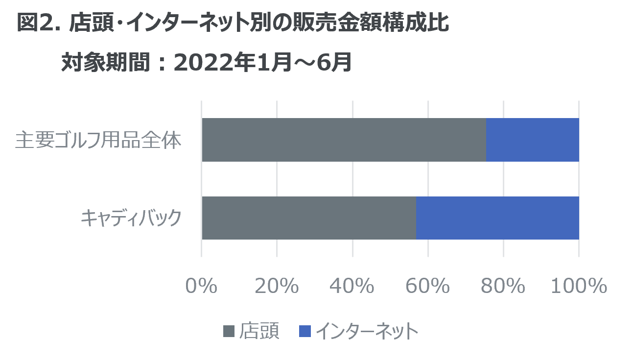 ・2022年1月~6月のキャディバックのインターネット販売比率は、同品目の販売金額全体の約40%となり、主要ゴルフ用品全体と比較して高い傾向が見られた。