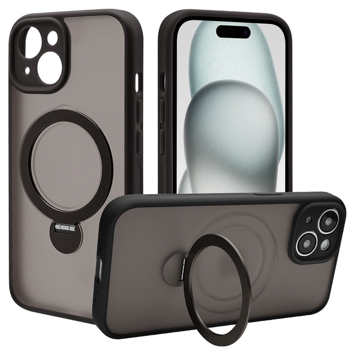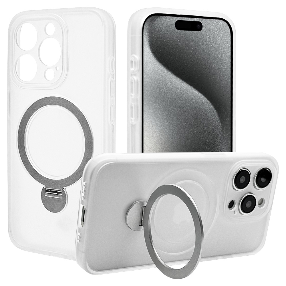 指が通せて操作安心、120度開閉&360度回転でお好みの角度に調整可能な、MagSafe対応リング付き。