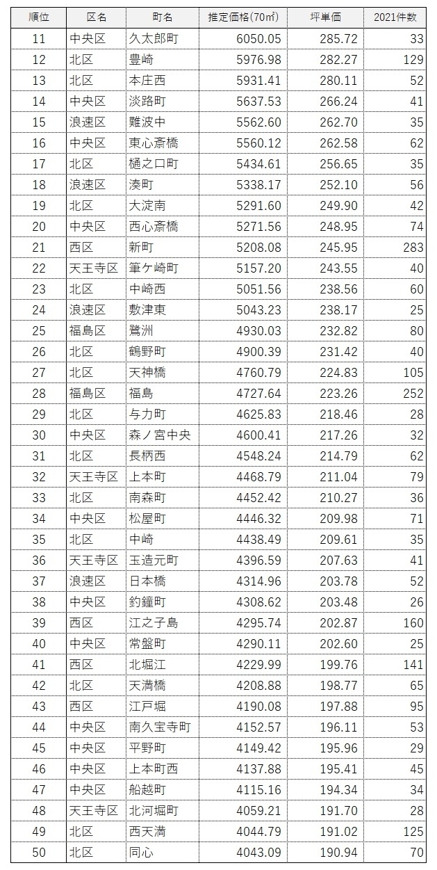 ・1位は「北区大深町」の1億3,513万200円。再開発エリア「うめきた」内の町名で「グランフロント大阪オーナーズタワー」があり、推定価格が唯一1億円を超えた。
