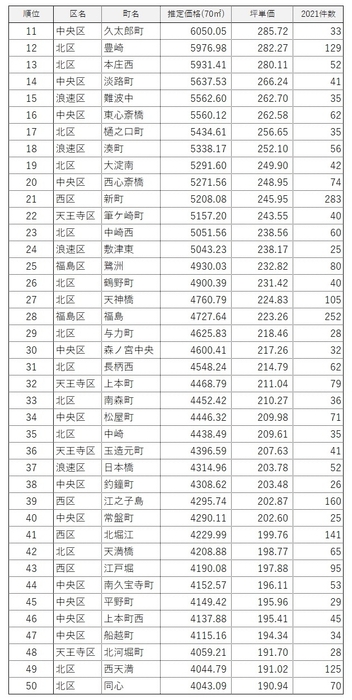 ・1位は「北区大深町」の1億3,513万200円。JR大阪駅(梅田)北側の再開発エリア「うめきた」内の町名で「グランフロント大阪オーナーズタワー」があり、推定価格が唯一1億円を超えた。