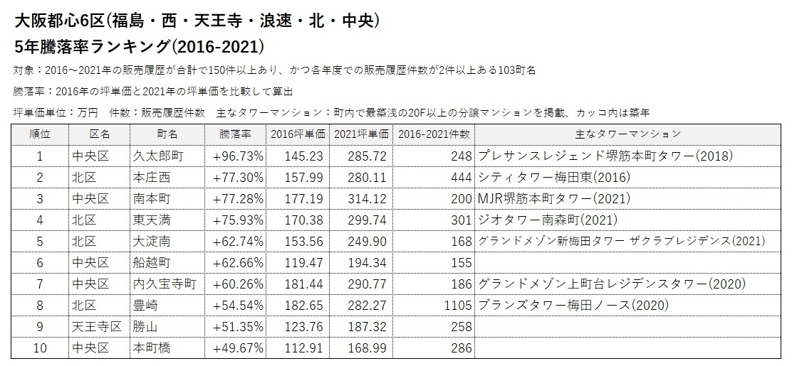 「不動産×WEB×ビッグデータ」の領域で、さまざまな不動産テックサービスを展開する株式会社ワンノブアカインド(本社:東京都港区、代表取締役社長:川島 直也、以下当社)は、当社が運営するマンション情報サイト「マンションレビュー」の保有データを元に、「大阪都心6区(福島区・西区・天王寺区・浪速区・北区・中央区」の各町名における、中古マンション相場および2016年からの相場推移について調査。最新の中古マンション価格*1とあわせて、2016年の坪単価と比較した騰落率のランキングを発表いたします。