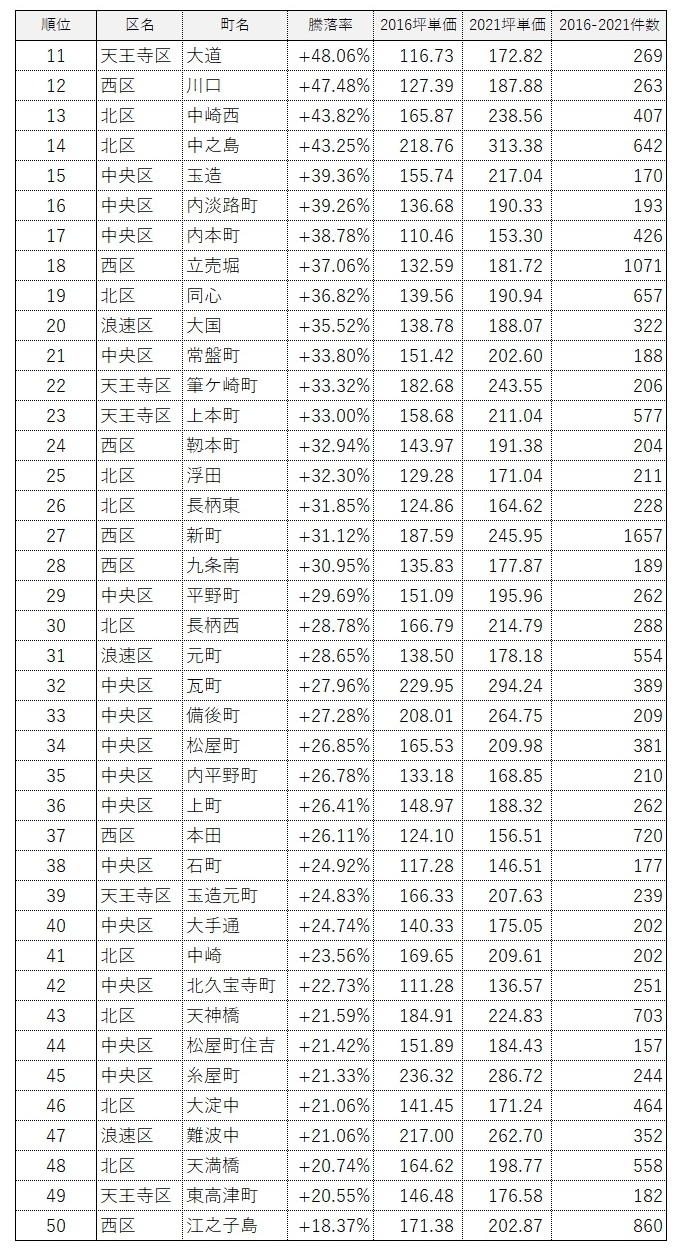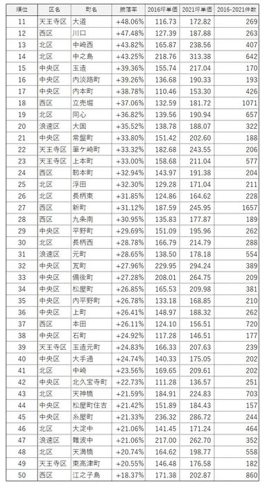 ・1位は「中央区久太郎町」の+96.73%。2016年と比較して、坪単価が約2倍弱まで上昇した。