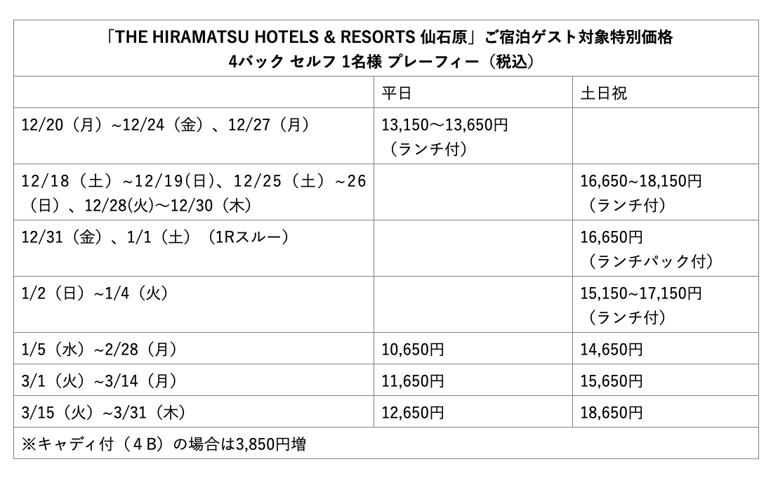 「THE HIRAMATSU HOTELS & RESORTS 仙石原」にご宿泊のお客様を対象に、太平洋クラブ「御殿場ウエスト」を特別価格でご利用いただけます。今年12月~来年3月のプレーフィーは、4バックセルフで1名様平日10,650円~、土日祝14,650円~、年末年始料金も平日扱い13,150円~、土日祝扱い16,650円~と魅力的な価格でのご提供です。ラグジュアリーな空間とおもてなしが叶える、心に残るゴルフ旅をぜひお愉しみください。