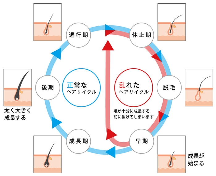 髪の毛は伸びることと抜けることを繰り返し映え変わりを行っています。この生え変わる周期を「毛周期(ヘアサイクル)」といいます。元気で健康的であれば、このサイクルは規則的で髪の寿命も長くなります。