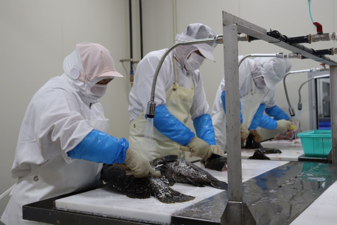 宮崎県都農町で、岡山理科大学と同町、NTT東日本・西日本が連携して量産化・ビジネス化に取り組んでいる好適環境水によるハタ科の「タマカイ」の陸上養殖で、10月21日、養殖施設から水揚げしたタマカイをふるさと納税返礼品用の鍋セットに加工する作業がスタートしました。11月中旬には発送される予定です。