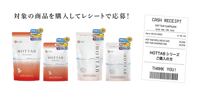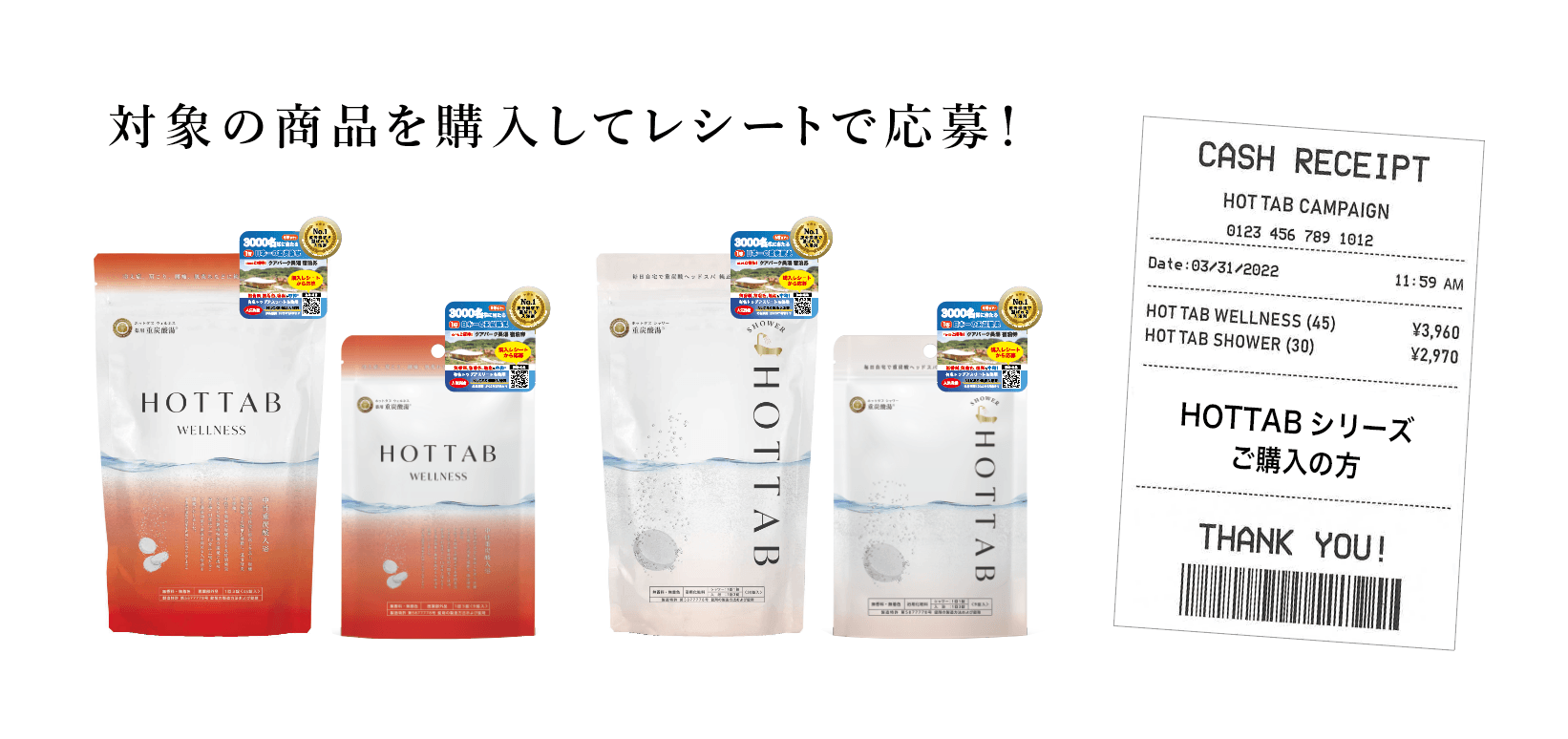 店頭で重炭酸入浴剤「HOT TAB」をご購入いただき、ご応募くださった方の中から抽選で3,000名様以上にプレゼントが当たるキャンペーンを実施します。