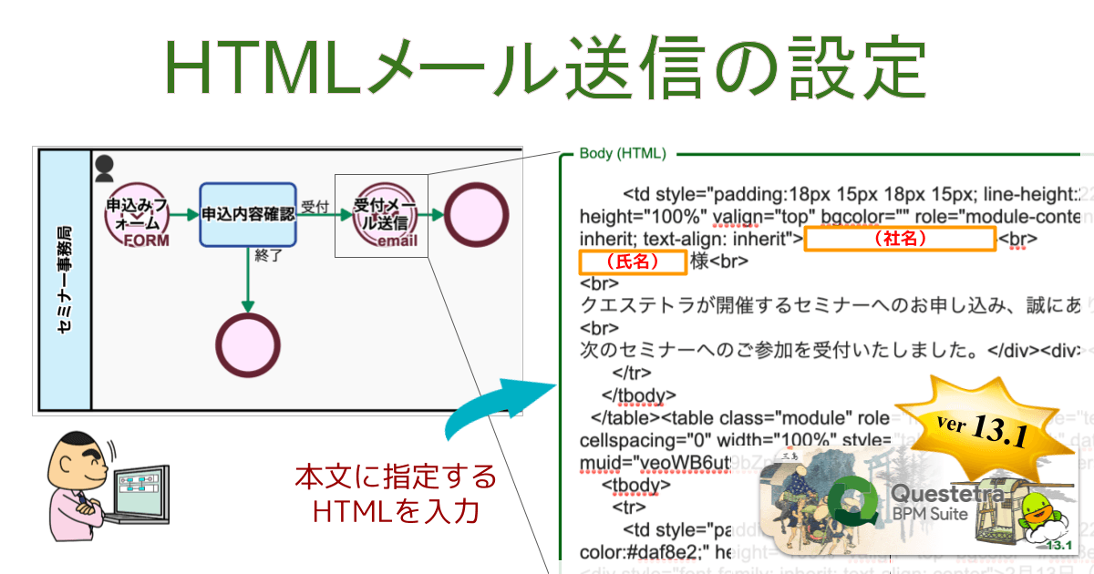 これまでの『Questetra BPM Suite』では、例えば、セミナー申込者に送信される電子メールの本文には、申込時に入力された社名や氏名が自動的に挿入されましたが、装飾のないシンプルな文章しか指定できませんでした。新バージョンでは、HTMLでメール本文を指定できるようになり、文字に色をつける、画像を挿入する、リンクが設定されたボタンを配置する、というようなことを実現できるようになります。