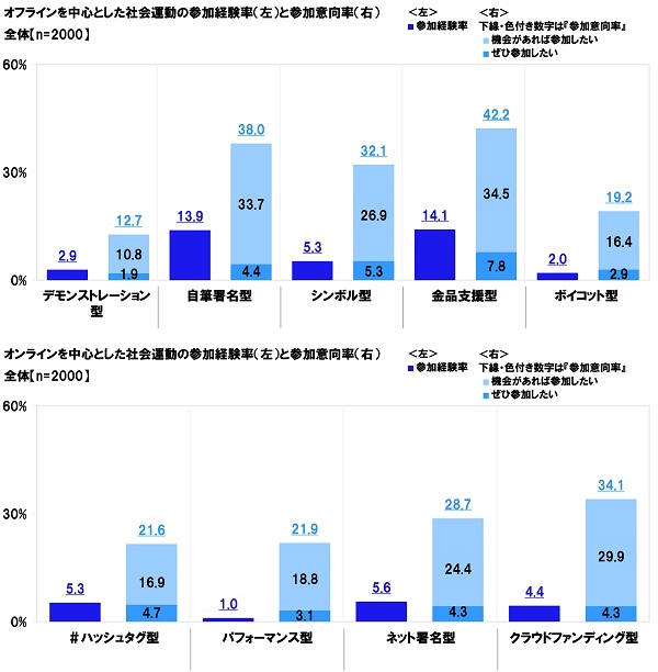 全回答者(2,000名)に、参加したことがある社会運動を聞いたところ、参加したことがある人の割合(以下『参加経験率』)は、オフラインを中心とした社会運動では、「デモンストレーション型(デモ行進や街頭宣伝行動など)」2.9%、「自筆署名型(請願等のために手書きの署名を集める、手書きの署名を行う)」13.9%、「シンボル型(バッジを付ける、マークのある商品を買うなど)」5.3%、「金品支援型(募金活動を行う、金銭や物品を寄付する)」14.1%、「ボイコット型(抗議行動としての商品の不買、イベントの不参加、サービスの拒否など)」2.0%となりました。