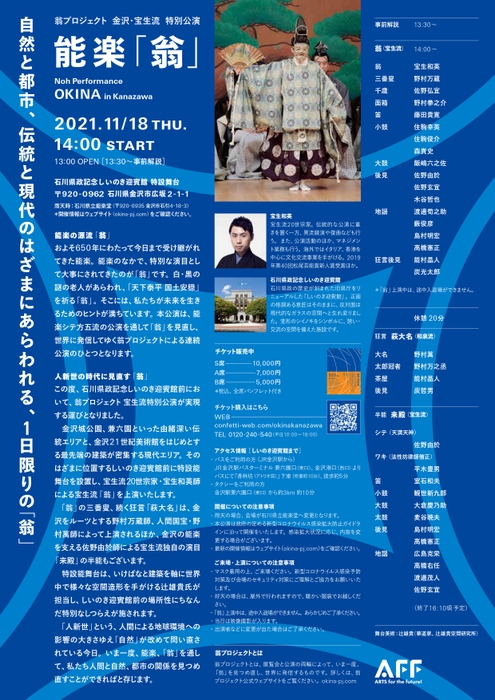 翁プロジェクト「金沢・宝生流 特別公演 能楽『翁』」が2021年11月18日 (木)に石川県政記念しいのき迎賓館 特設舞台(石川県金沢市)にて開催されます。チケットはカンフェティ(運営:ロングランプランニング株式会社、東京都新宿区、代表取締役:榑松⼤剛)にて発売中です。