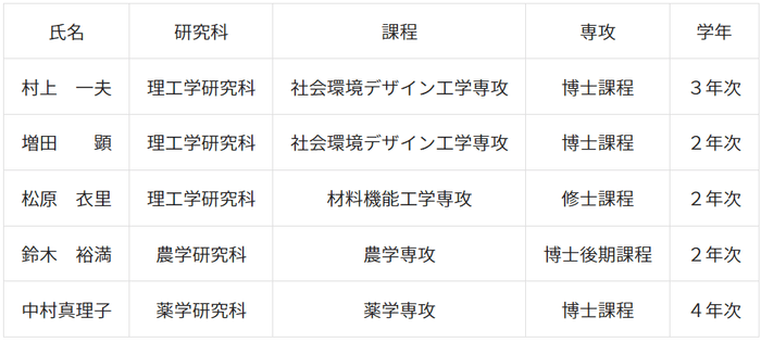 第2回の赤﨑勇賞に決まったのは次の皆さんで、理工学研究科から3人、農学研究科から1人、薬学研究科から1人です。