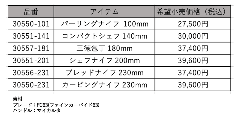 6月に先行で限定発売した三徳包丁に加え、プロや料理愛好家にも人気の高いシェフナイフなど5アイテムを追加し、充実したラインナップが定番となります。
