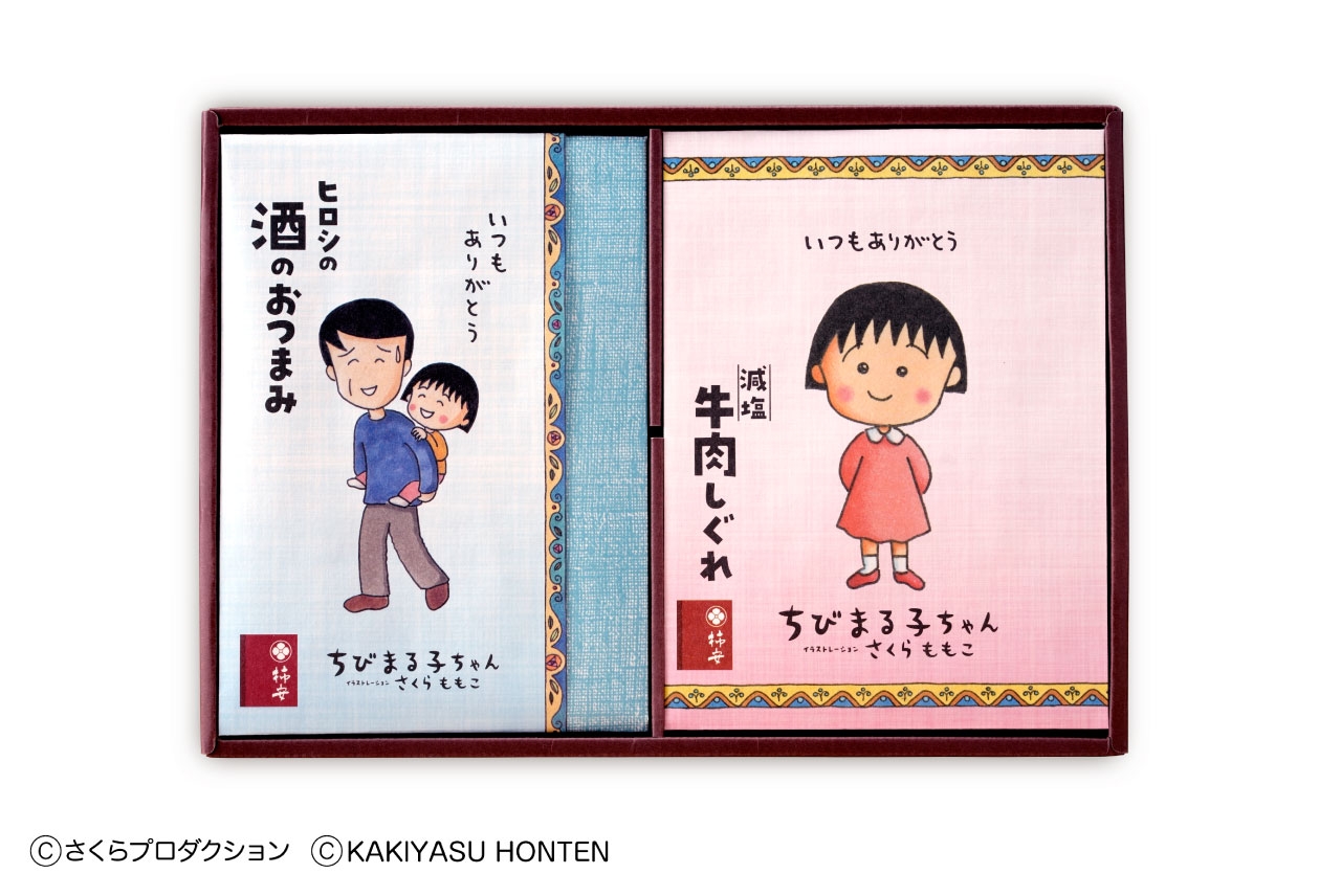 「柿安オンラインストア」限定で、「ちびまる子ちゃん」や「絵本 まるコジ」とのコラボレーション商品を詰め合わせたギフトセットを販売いたします。なかでも『ヒロシの酒のおつまみ 詰合せ 』(どら焼入りは)、『ヒロシの酒のおつまみ』とロングセラー商品『減塩 牛肉しぐれ』、さらに柿安が手掛ける和菓子ブランド「口福堂」の人気商品『どら焼』が2つ入った、豪華なセット内容となっています。ぜひ、大切な方に贈るギフトとしてご利用ください。