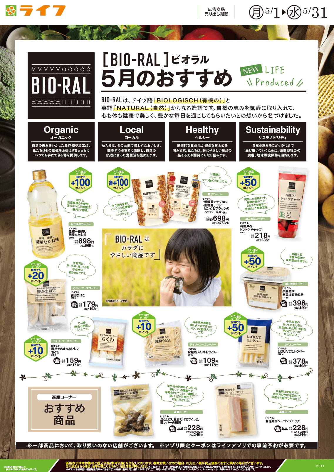 “おいしい” “ワクワク” “ハッピー” をお届けするライフコーポレーションは、健康志向のお客様におすすめしたいBIO-RAL(ビオラル)商品を、毎月お試し価格やポイントプレゼントなどでお得にご提供しております。5月のおすすめは「国産なたね油」、「有機JASトマトケチャップ」、「素材そのままおいしいちくわ」「鶏レバーの燻製」などの人気商品を含む11品です。
