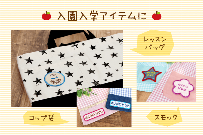 入園・入学準備に使われるお名前ワッペン。レッスンバッグや靴袋、赤白帽にスモック、お昼寝布団などの名入れにお使いいただけます。