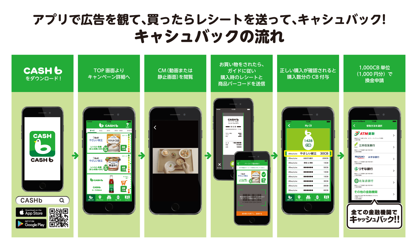対象となる商品は、「やさしい献立」のレトルト各種・カップ120g各種の合計49品です。それぞれ、商品1個につき、レトルトは30円、カップは40円が還元される仕組みです。アプリをダウンロードしたら、トップ画面からキャンペーン詳細ページに入り、「やさしい献立」のCM動画や商品紹介ページを閲覧します。閲覧後に対象商品を購入し、商品名が記載されたレシートと商品バーコードを送信すると、キャッシュバックポイント「CB」(シービー)がもらえます。「CB」は、すべての金融機関の口座で現金として受け取ることができます(条件あり)。商品を購入する場所や方法を選ばず、スーパーやドラッグストア、ネットスーパーや通販の利用でも申請が可能なため、お好みの購入形態でキャンペーンに参加することができます。