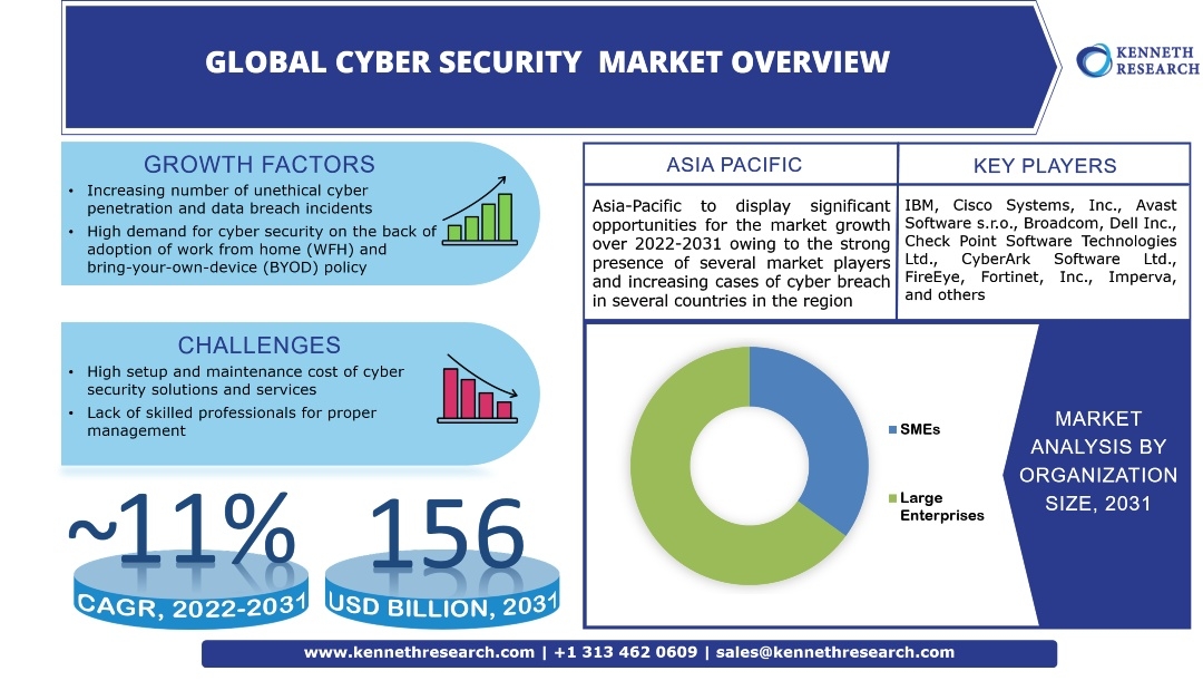 サイバーセキュリティ市場は、2022年から2031年にかけて約11%のCAGRで非倫理的なサイバー侵入およびデータ侵害インシデントの増加を背景に成長を目撃する。世界市場は2031年までに約1,560億米ドルの規模になる見込み