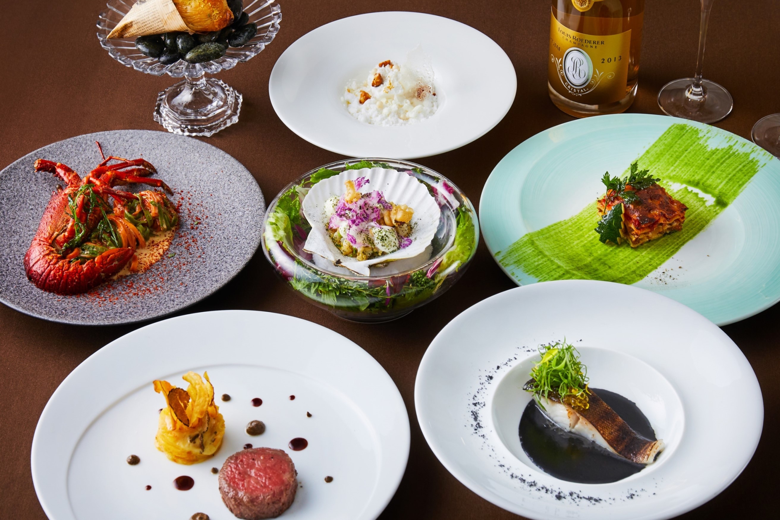 この時期ならではの至高の食材を駆使し、職人が趣向を凝らしてご用意した目にも色鮮やかな品々。盛り付けの細部にまでこだわった前菜やスープ。何よりも職人が目の前で豪快に焼き上げる伊勢海老とタラバ蟹の鉄板焼きや黒毛和牛ステーキはサーロイン、フィレ、シャトーブリアンからお選びいただけるメインは五感を愉しませてくれます。