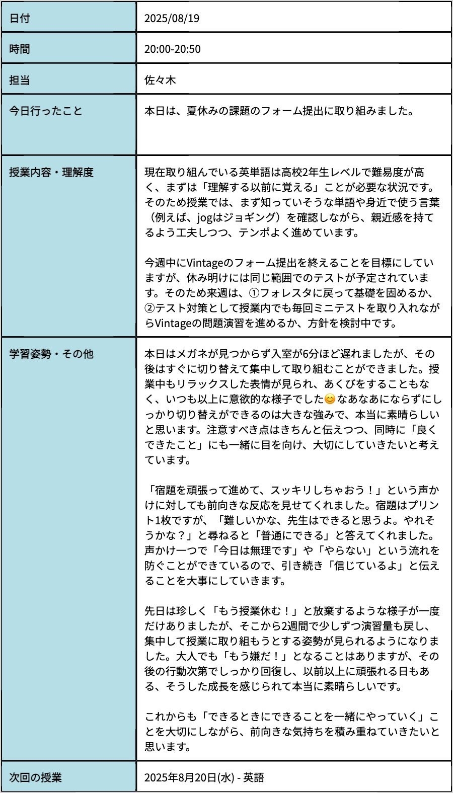 内容は学習進度や理解度に加え、お子さんの様子や家庭での声かけ方法まで具体的にアドバイス。これにより、保護者が安心して伴走できる体制を整えています。