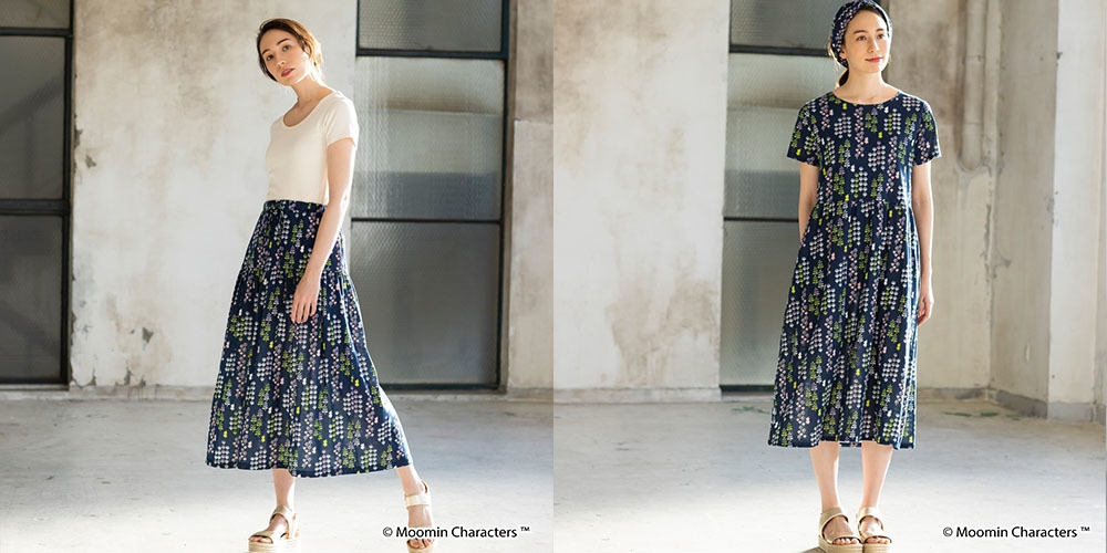 オーガニックコットン100%のサテン地のノスタルジックなプリントのシリーズは、小説『ムーミン谷の夏まつり』に登場する森の中で遊ぶ動物や女の子がムーミンたちと一緒に描かれています。自然な光沢感としなやかさが特徴の柄で、トップス2型と、スカート、ワンピースをご用意しました。