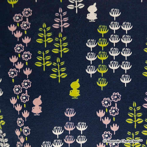 続いて、デイリーに使いやすいオーガニックコットン100%の天竺素材のシリーズは、お花畑にただずむリトルミイのグラフィカルなプリントのシリーズです。ゆったりラクな着心地なのに、華やかさもあるアイテムに仕上げました。こちらの柄で、トップス2型と、スカート、ワンピースをご用意しました。