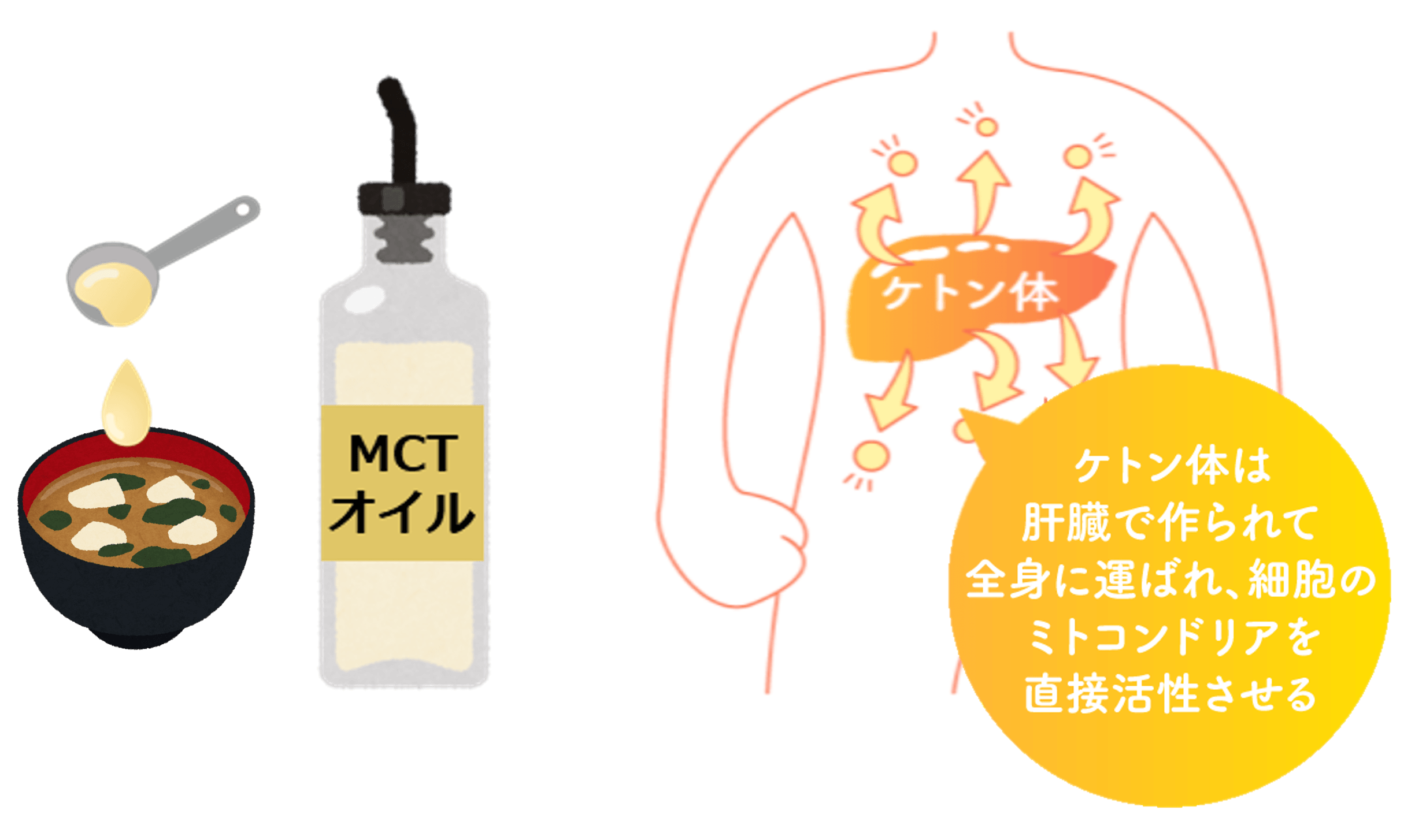 「ミトパワー」を高める方法として、タンパク質・ビタミン摂取や糖質制限などがありますが、無理なく続けられる方法としておすすめなのが、普段の食事にMCTオイルを摂り入れることです。