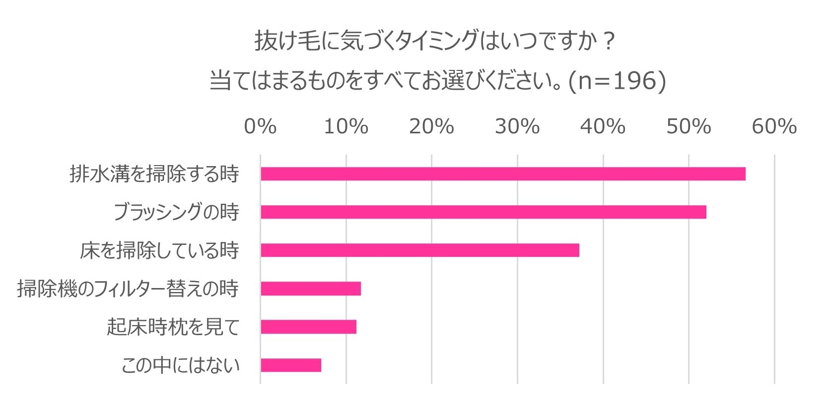 「抜け毛が気になる」と答えた196名に「抜け毛に気づくタイミングはいつですか?」と聞くと、「排水溝を掃除する時」が57%と最も多く、「ブラッシングの時」「床を掃除している時」と続いた。