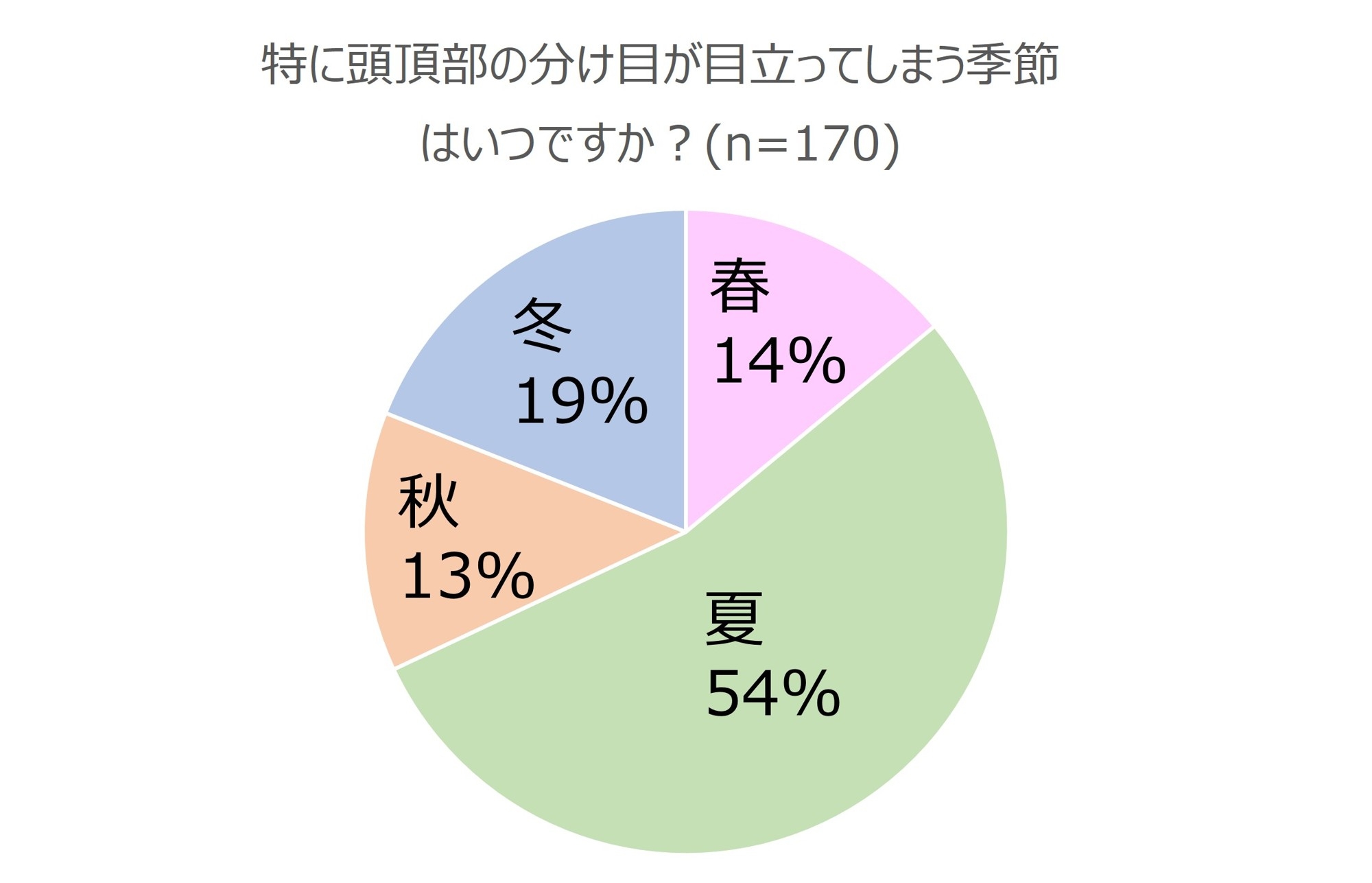「特に頭頂部の分け目が目立ってしまう季節はいつですか?」と聞くと、「夏」が54%と最も多かった。その理由として、「帽子をかぶり汗もかくので髪の毛がペタンコになってしまう」、「太陽の光で地肌が照らされて透けて見えそうな気がする」があげられた。