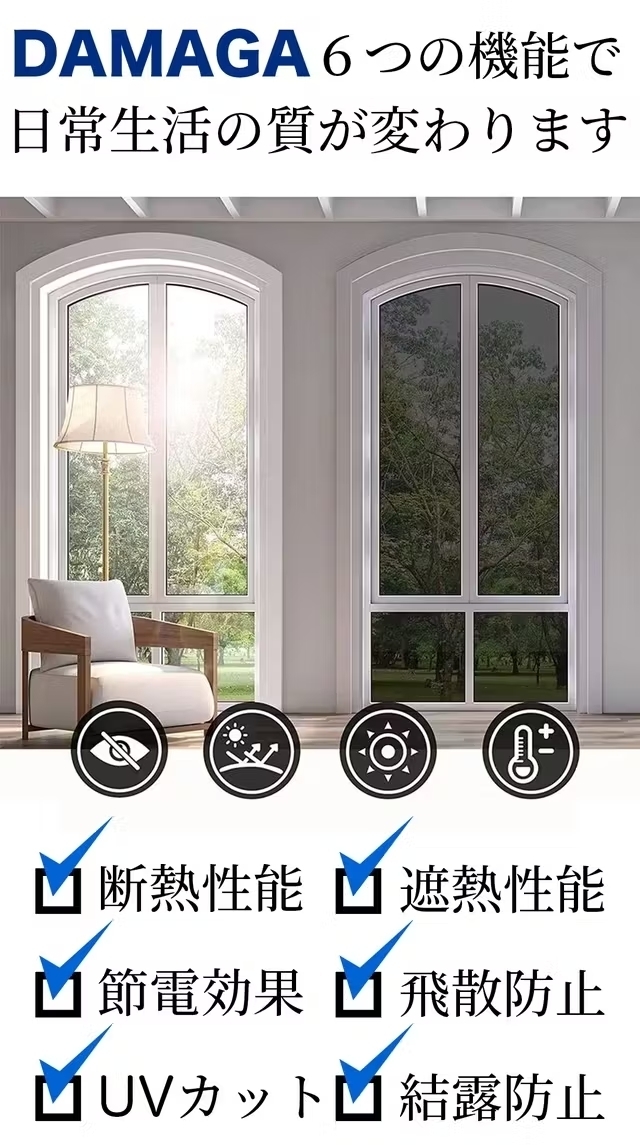 古い住宅の断熱不足による光熱費高騰や居住快適性の低下といったお客様の声に応えて開発された本製品は、遠赤外線再放射技術による高断熱性能と99%以上のUVカット機能を併せ持ち、工具不要の水貼りDIY施工で誰でも手軽に省エネ効果を実感いただけるような商品となっております。