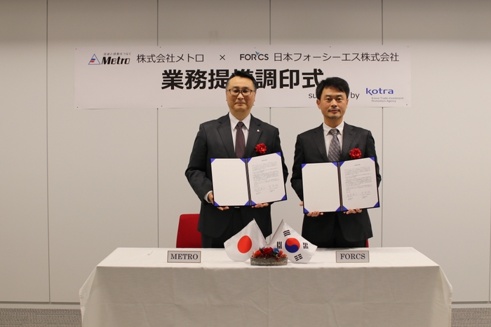 調印式当日は、KOTRA東京IT支援センター (東京都千代田区霞が関3丁目1-5 霞が関ビルディング 5階)で行われ、KOTRA日本地域本部長の鄭外永(ジョン・ウェヨン)と株式会社メトロ代表取締役社長の國清康之、FORCS株式会社CEOの朴美京(パク・ミギョン)、日本フォーシーエス株式会社代表取締役社長の梁泰植(ヤン・テシク)が参加しました。※朴美京はオンラインで参加。