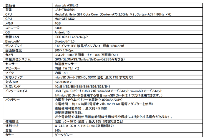 8.7インチ SIMフリー Android™ タブレット【aiwa tab AS8L-2】:22,800円(税込)