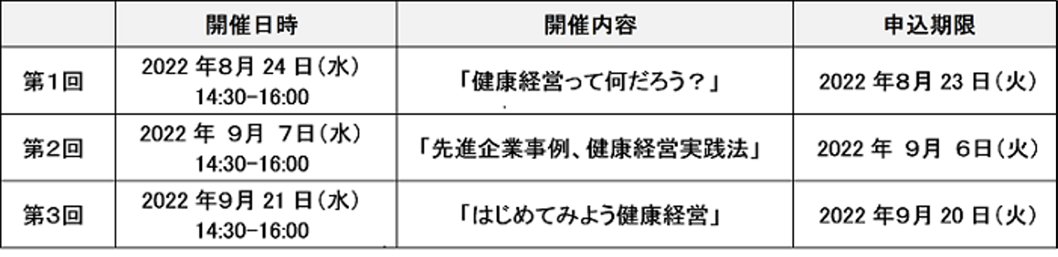 この度、健康経営に関心のある企業の健康経営推進担当者の皆様に向けて、全3回の勉強会を開催し、健康経営の取り組みを支援いたします。
