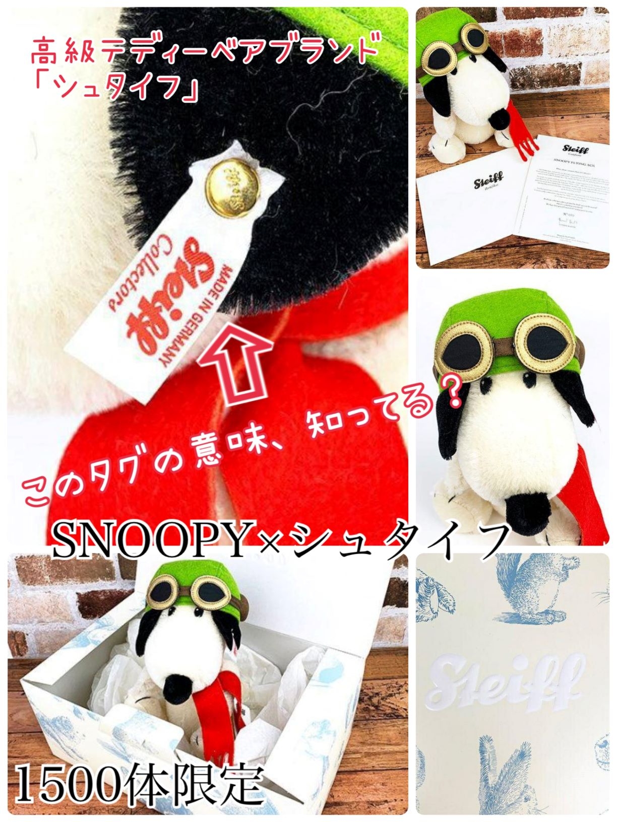 1877年に誕生したテディベアの最高級ブランド「シュタイフ」1体あたり数十万で取引されることもある、ドイツのテディベアメーカーです。そのシュタイフから1500体限定で「フライング・エース」のスヌーピーが生産されました!調べてみたところ、シュタイフのぬいぐるみの耳についているタグには意味があるらしい…!