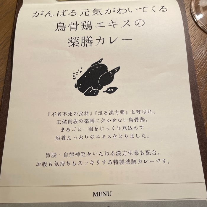 薬膳は自律神経と胃腸に効くものを中心に構成、疲れていると苦味を感じないカレーです。