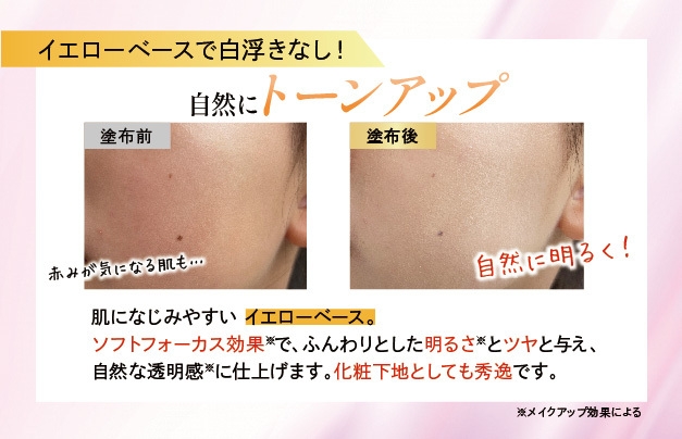 肌になじみやすく白浮きしないイエローベース。ソフトフォーカス効果※4によって光反射をコントロールしてトーンアップ※4。肌の凸凹をなめらかに整え、くすみを感じない自然な透明感※4に仕上げます。
