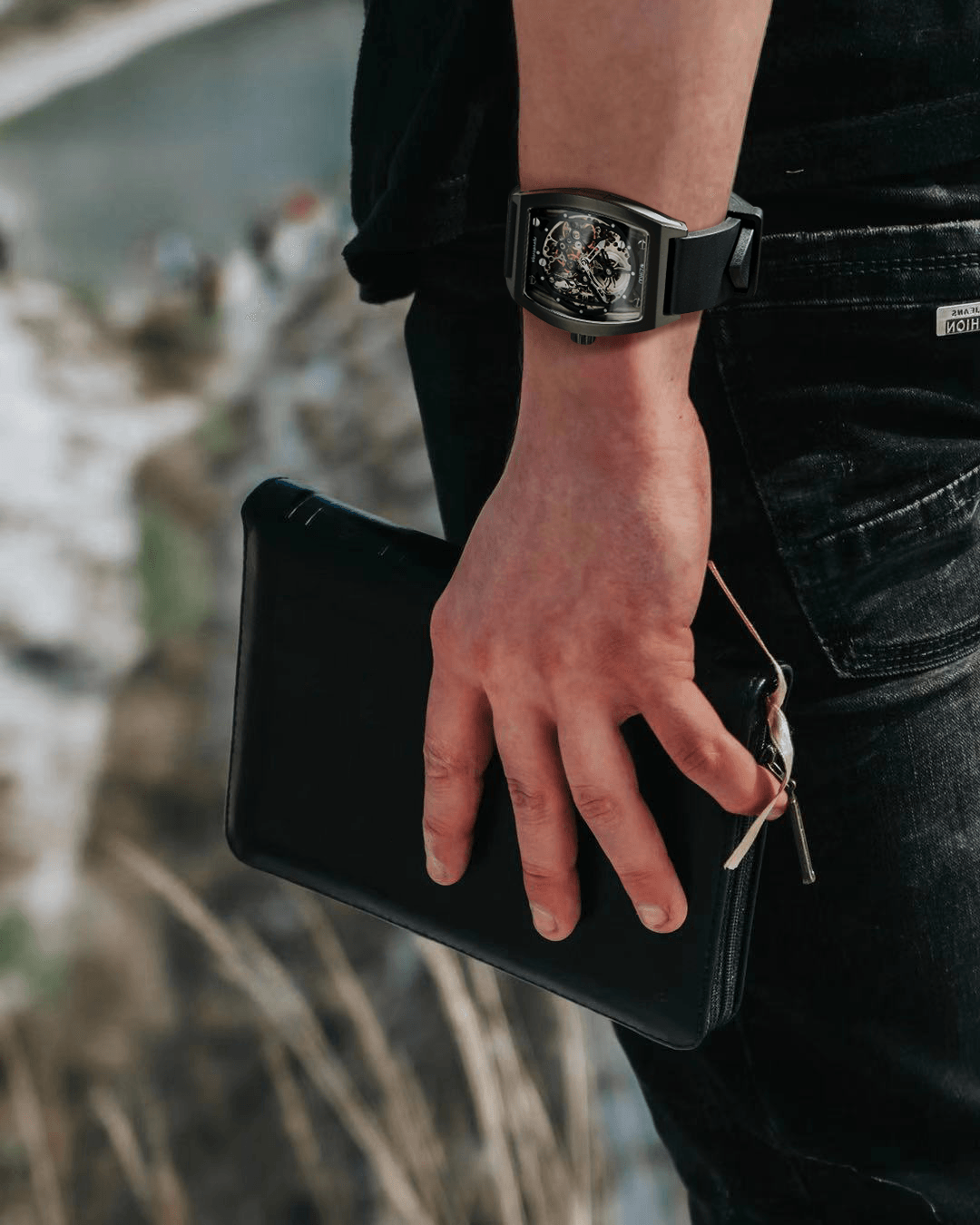 3mmにも満たない極薄機械式手巻きスケルトンムーブメントを美しいトノー型ケースに収めました。見た目の美しさ、格好良さだけでなく、素材にもこだわっています。本体ケース素材には高級ブランドが採用するものと同じ316Lステンレススチールを、風防も同様にサファイアクリスタルを仕様し、デザイン、素材、使い勝手にもこだわり抜いています。