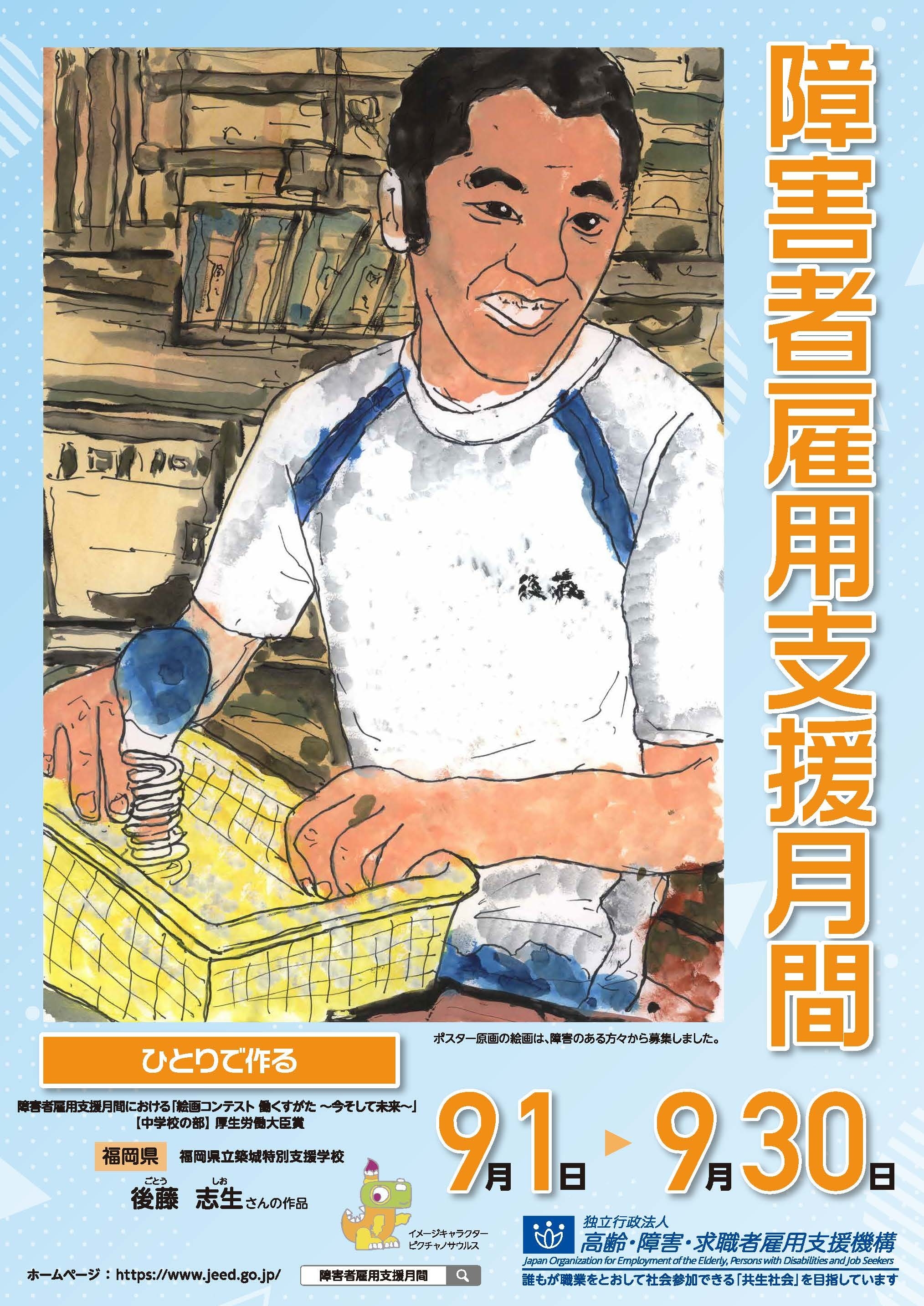 9月は障害者雇用支援月間です。当機構では、障害者雇用への理解と関心を深めていただくため、毎年、働くことや仕事に関係する内容の絵画及び障害のある方が働いている姿を撮った写真を障害のある児童・生徒をはじめ広く募集し、その優秀作品をもとに障害者雇用支援月間のポスターを作成、掲示しています。